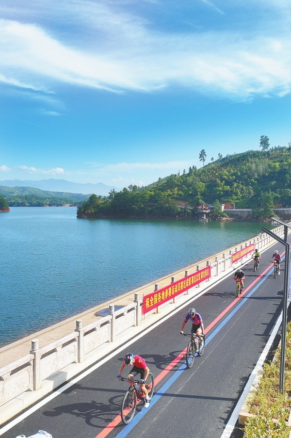 9月8日,2024年湖南·衡山“九观湖”环湖自行车赛在衡山县店门镇九观湖风景区开赛。来自全国17个省市的735名自行车运动爱好者在青山绿水间竞技角逐,享受竞技体育与自然风光的美好。图为比赛现场。曹正平 夏建军 周怡然 摄影报道(湖南图片库)