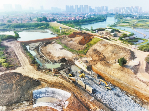 9月10日,澧县澧浦街道十回港村与卢家社区接壤地段,施工机械正在紧张进行堤身朝天口开挖作业。澧县十回港中型闸除险工程是该县国债排涝能力建设项目之一,是澧阳平原灌区最重要的防洪、排涝和灌溉水闸工程,保护人口35万。