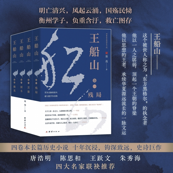 近代以来,随着《船山遗书》的刊行于世,产生了多种研究船山思想的派别或思潮。但是,用历史小说的形式再现船山坎坷颠沛而潜心著述的一生,揭示其贞固的人格操守特别是学术思想穿透云层的力量,一直到近年来才始见端倪,聂茂教授的四卷本长篇历史小说《王船山》(团结出版社2024年6月版)一经问世就受到全国读者青睐,登上当当网历史类新书排行榜首位,确证着当代读书人对该书的认可与欢迎程度。