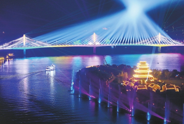 9月19日,兴洲号夜游湘江船行驶在衡阳市湘江东洲岛段璀璨的夜色里。第三届湖南旅发大会即将在衡阳举行,该市湘江两岸东洲岛到石鼓书院段的美化亮化工程全面竣工。曹正平 摄(湖南图片库)