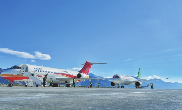 C919大型客机,是我国首次按照国际通行适航标准自行研制、具有自主知识产权的喷气式干线客机。图为当日,一架C919飞机(右)与一架ARJ21飞机停放在西藏拉萨贡嘎国际机场停机坪上。新华社 发