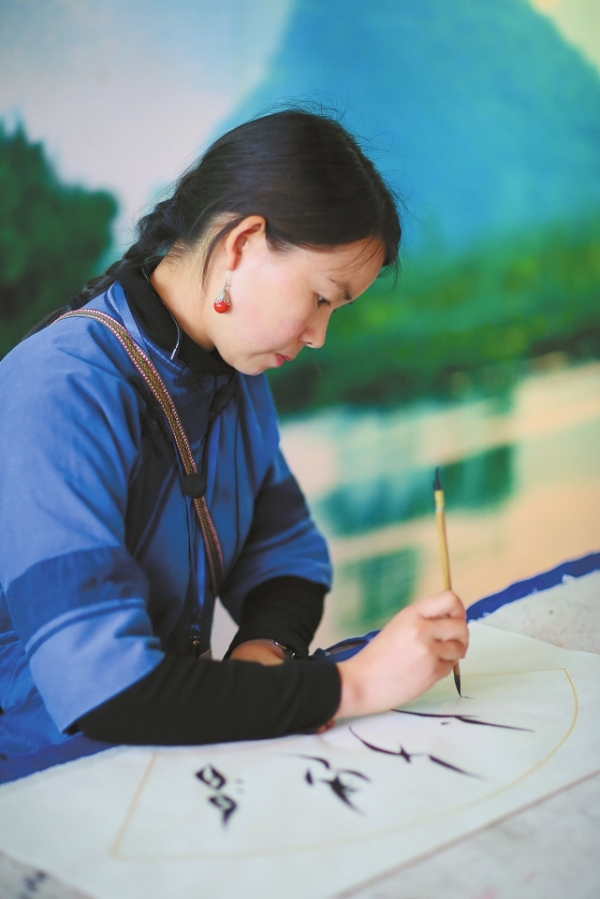 潇水河畔,女书岛上,一批批游客从全国各地而来,学写女书字,学唱女书歌。暑假是旅游旺季,女书教员胡美月一天最多要给游客上20多堂课。