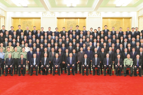 上午10时许,习近平等党和国家领导人来到人民大会堂北大厅,全场响起长时间热烈掌声。习近平等同大家亲切握手,并合影留念。