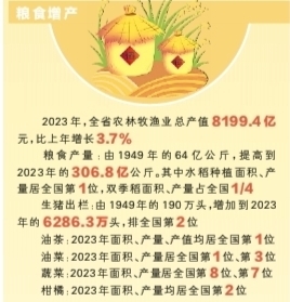 努力让“中国人饭碗”里盛更多“湖南粮”。75年来,湖南粮食生产实现跨越式发展。2023年湖南粮食总产量是1949年的近5倍。其中,湖南水稻种植面积、产量居全国第一。