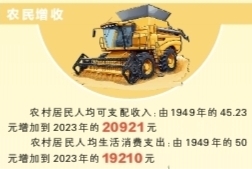 75年来,湖南农业农村发生翻天覆地的变化:湖南粮食总产量从1949年的64亿公斤跃升至2023年的306.8亿公斤,湖南农村居民人均可支配收入从1949年的45.23元跃升至2023年的20921元。一幅农业强、农民富、乡村美的画卷,正在三湘大地上徐徐展开。