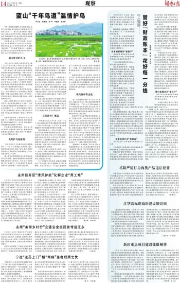 该县将“千年鸟道”管护体系改革纳入全县“十项重点改革”,形成多层次的制度管理格局。去年来,先后制定出台蓝山县保护“千年鸟道”安全专项行动方案、候鸟保护“十大”长效机制、候鸟保护巡护值守实施方案等方案。县委全会通过了推动“千年鸟道”保护常态长效的实施意见。今年3月,县“两会”分别形成了推动“千年鸟道”保护常态长效的政治决议、关于在全县深入开展候鸟等野生动物保护工作的决议。多个候鸟保护政策文件的出台,把候鸟保护责任落实到单位、到人,形成全县上下“一盘棋”抓候鸟保护的格局。