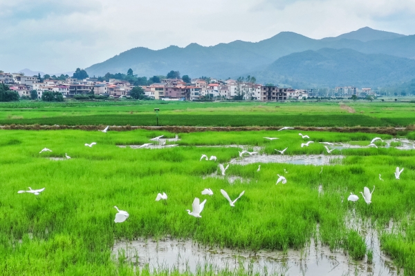 9月23日,蓝山县塔峰镇雷家岭村,成群的白鹭在田间飞翔、觅食,与青山、绿野相映成景,构成一幅美丽和谐的自然生态画卷。 彭华 摄