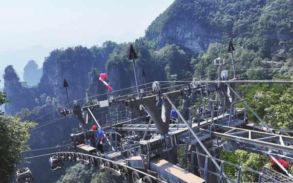 9月27日,张家界国家森林公园天子山索道工作人员对索道运行设施进行检查维护,以保障假期旅游安全,进一步提升游览体验。吴勇兵 摄(湖南图片库)