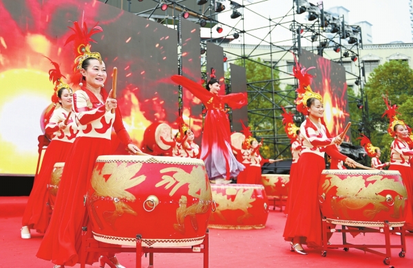 10月1日,洞口县文昌街道雪峰广场,鼓手们敲起欢快的鼓点、载歌载舞,庆祝中华人民共和国成立75周年。当天,该县社会各界人士以“庆国庆、颂祖国”为主题举办形式多样的庆祝活动。滕治中 摄(湖南图片库)