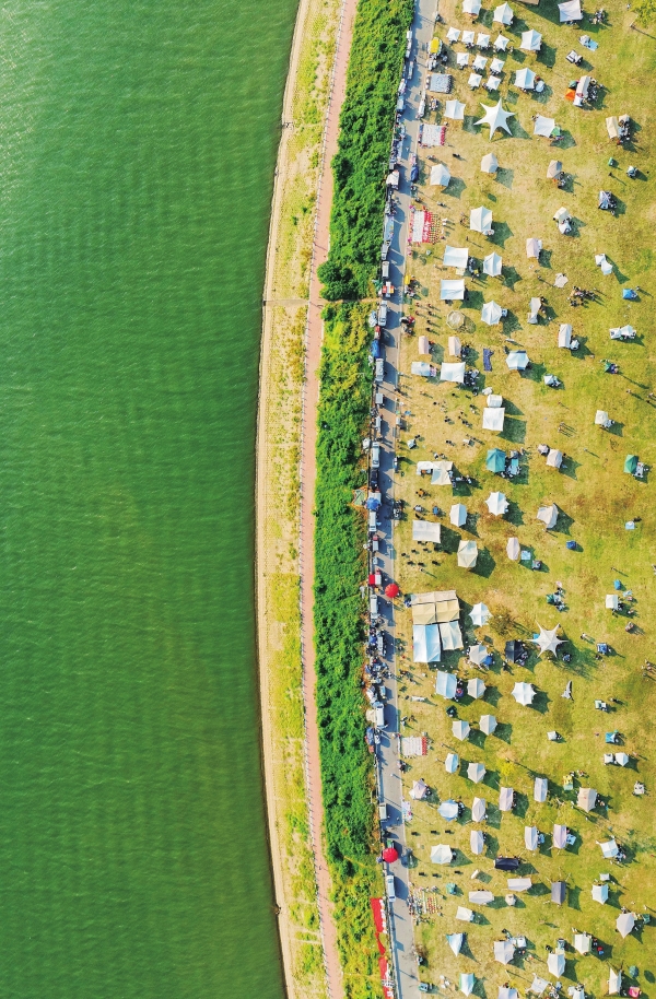 10月6日,长沙市湘江风光带,游客在草地上露营。湖南日报全媒体记者 李健 摄
