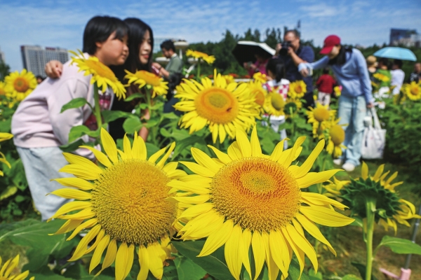 10月3日,游客在省植物园的向日葵花海中游玩。国庆假期,湖南省植物园的10余个品种10万余株向日葵进入最佳观赏期,吸引许多游客前来观光游玩,乐享假日好时光。