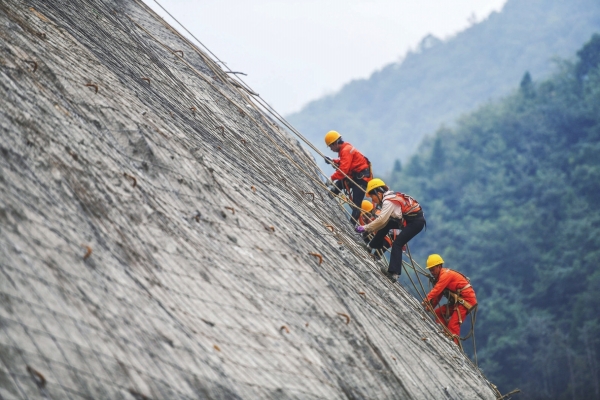 10月9日,工人在道县洪塘营瑶族乡湖南紫金锂业有限公司峭壁工地进行生态修复作业。近年来,该县持续实施生态保护修复工程,对破损山体进行生态修复和边坡治理,筑牢生态屏障。蒋克青 廖荣 摄影报道(湖南图片库)
