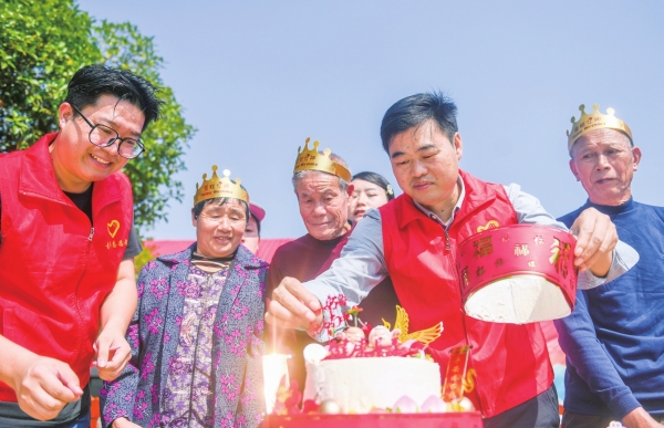 10月10日,道县柑子园镇五福敬老院,志愿者为老人集体祝寿。连日来,当地开展重阳节主题活动,弘扬尊老、敬老、爱老的传统美德。蒋克青 摄(湖南图片库)