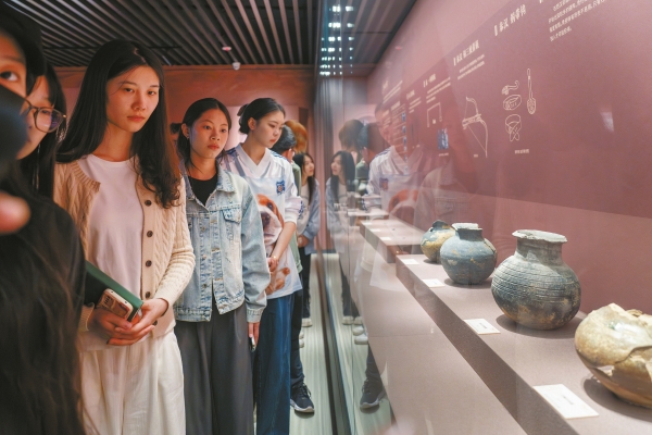 10月17日,观众在了解出土的部分陶器。当天,“谊居千年——贾谊故居南侧朝阳巷工地考古成果展”在湖南师范大学博物馆开展。展览首次展出了2022—2023年贾谊故居南侧朝阳巷工地的考古工作成果,包括150余件瓷器、铜器、陶器等珍贵文物。展览持续至2025年4月10日,免费对外开放。