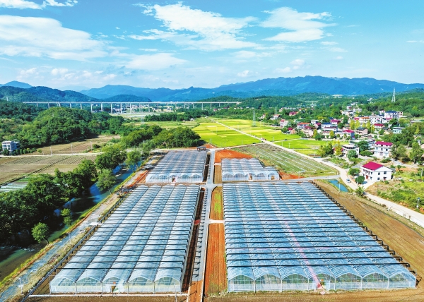 10月17日,东安县白牙市镇宥江桥村,整齐的果蔬大棚、黄绿相间的稻田、四通八达的公路与错落有致的村庄交相辉映,组成一幅美丽的新农村画卷。近年来,当地因地制宜推广“稻、蔬、果、鱼”生态种养、多种经营,促进农民增收。