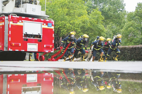 10月16日,永州市消防救援支队,消防员在进行枪炮协同灭火操项目竞赛。近日,该支队举办体技能比武竞赛,来自全市的12支参赛队伍132名消防救援人员围绕人车拔河、枪炮协同灭火操、高楼快攻操等项目展开比拼,旨在提高实战化水平和攻坚能力。