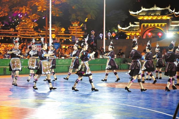 10月17日晚,通道侗族自治县沿河风光带,各族群众载歌载舞,庆祝通道侗族自治县成立70周年。 李尚引 摄(湖南图片库)