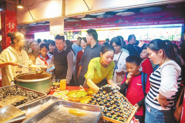 10月19日晚,娄底市文旅促消费湘品展销现场,市民在选购美食。今年以来,当地通过政府搭台、全民参与的形式举办系列展会,聚集消费资源、吸引消费回流,进一步提升消费活力。