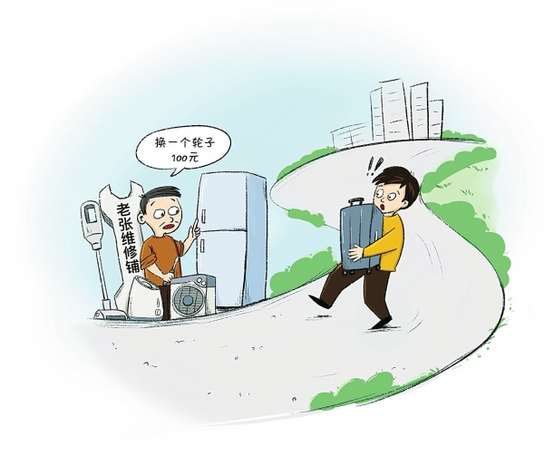 拉杆箱坏了个轮子,找来找去在离家17公里的一个小巷子里找到了一家维修店,上去一问换个轮子要100块钱。这样的拉杆箱,丢了吧,太可惜;维修吧,并不便宜。这是笔者近日遇到的纠结事。