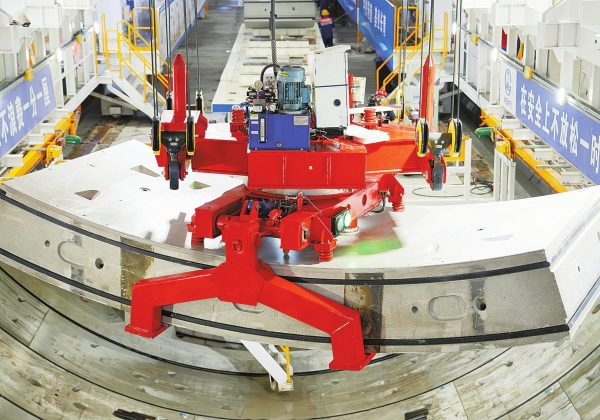 10月20日,在上海沪渝蓉高铁崇太长江隧道施工现场,“领航号”盾构机进行管片吊装作业。当日,我国自主研制的世界最大直径高铁盾构机“领航号”在沪渝蓉高铁崇太长江隧道掘进突破1000环。崇太长江隧道连接上海崇明和江苏太仓,全长14.25千米,建成后有望实现高铁过江不减速。新华社 发