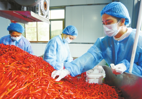 10月21日,嘉禾县珠泉镇大路村,村民在村办企业加工辣制产品。近年来,该村通过“企业+合作社+农户”模式,发展种植、加工、销售一条龙的辣椒产业链,带动当地群众增收。黄春涛 摄(湖南图片库)