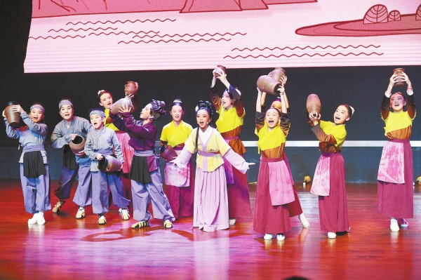 10月21日晚,小演员在表演少儿花鼓情景剧《我的长沙我的城》。当晚,长沙市开福区在长沙音乐厅开展“文化礼赞 致敬一线”主题活动,将优秀文艺作品献给基层人民群众、一线工作者。