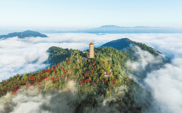 10月30日清晨,浏阳市西湖山公园晨雾缭绕,漫山遍野的枫树点缀其中,在朝阳的映照下秋意渐浓。罗豪正 摄(湖南图片库)