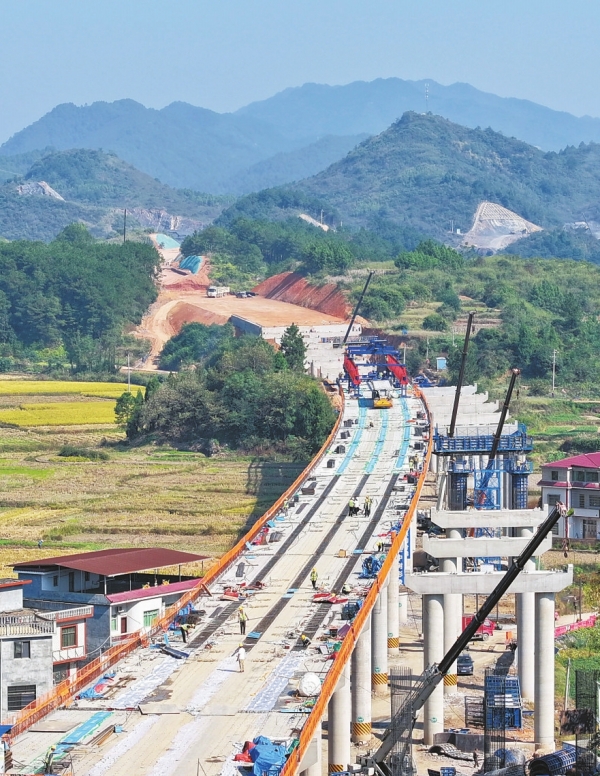 10月31日,道县梅花镇境内的零(陵)道(县)高速桥梁桥面施工现场。零道高速公路是省重点交通建设项目,建成后将打通永州向南接广西、广东通道,改善湘南山区交通状况。