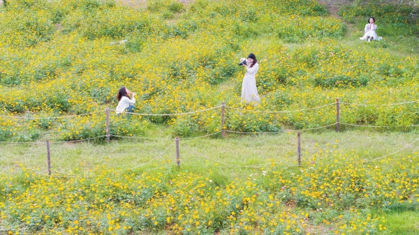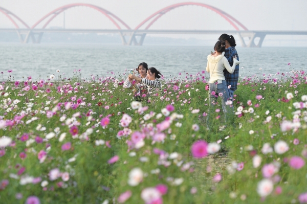 10月29日,长沙市马栏山鸭嘴公园,波斯菊竞相绽放,连绵成一片花的海洋。 |