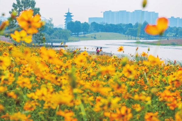 11月5日,长沙洋湖国家湿地公园黄秋英盛放,呈现出一派秋日胜景。 |