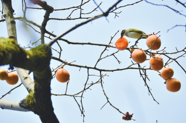 11月5日,湖南烈士公园,柿子树上挂满了金灿灿的柿子,引来白头鹎觅食。 |