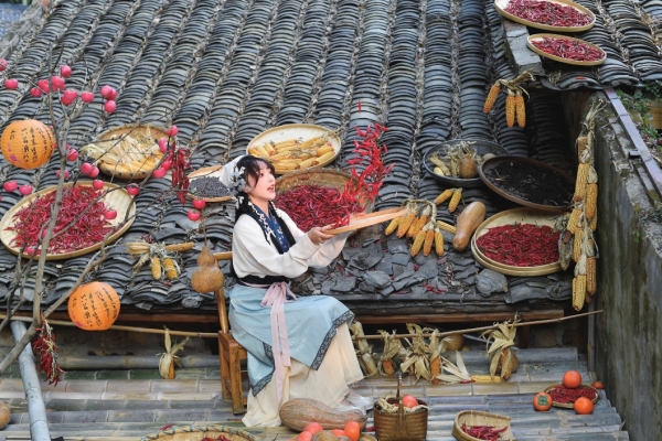 11月5日,长沙市开福区捞刀河街道白霞村,屋顶晾晒的红辣椒、玉米、南瓜等农作物,绘就一幅“晒秋”图。 |