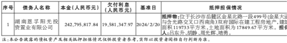 债权情况:截至2024年2月20日,湖南恩孚阳光投资置业有限公司债权资产合计人民币262,377,165.81元,其中本金人民币242,795,817.84元,欠付利息人民币19,581,347.97元。(如本金余额与借款合同或借据金额不一致,以借款合同、借据、法院判决为准)。