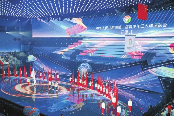 11月20日晚,中华人民共和国第一届青少年三大球运动会在湖南贺龙体育馆开幕。在这场以足、篮、排三大球为主题,充满仪式感、热血感、科技感的嘉年华上,少年与球共舞,欢呼不绝于耳。