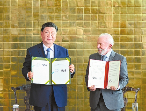 当地时间11月20日上午,国家主席习近平同巴西总统卢拉在巴西利亚共同签署并发表《中华人民共和国和巴西联邦共和国关于携手构建更公正世界和更可持续星球的中巴命运共同体的联合声明》。新华社 发