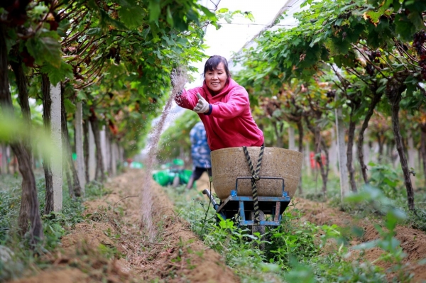 11月21日,通道侗族自治县万佛山镇坪地村葡萄种植基地,村民在葡萄树旁开沟、施肥,为来年做准备。李尚引 摄(湖南图片库)