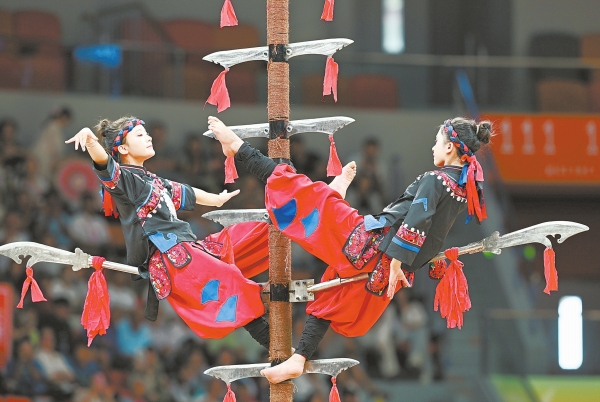 11月23日,第十二届全国少数民族传统体育运动会表演项目(室内)在海南省三亚市体育中心体育馆举行。图为当日,贵州队选手表演飞龙刀技。新华社 发
