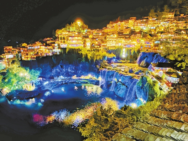 11月25日晚,永顺县芙蓉镇景区,游客在欣赏古镇夜色。近年来,芙蓉镇对科技夜景灯光进行亮化升级,丰富夜间产品和夜游项目,进一步“点亮”旅游夜经济。 湖南日报全媒体记者 徐行 摄