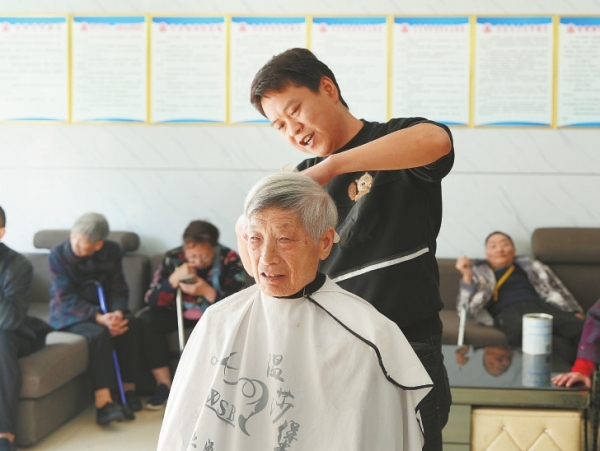 一把剪刀,一把梳子,一把电推剪,一推一剪,理发师康冬平麻利地给张固云老人理发。