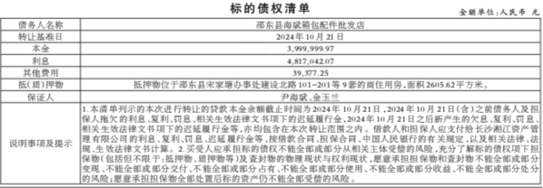 本次拟处置的资产为邵东县海斌箱包配件批发店债权资产(以下简称“标的债权”)。截至2024年10月21日(处置基准日),标的债权总额合计8,856,419.29元,其中:本金余额3,999,999.97元,利息4,817,042.07元,其他费用39,377.25元。标的债权明细详见下表: