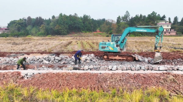 12月3日,工人在常宁市洋泉镇东塘村田间排水渠建设现场施工。入冬以来,该市抢抓冬季枯水期有利时机,扎实推进水利工程建设。