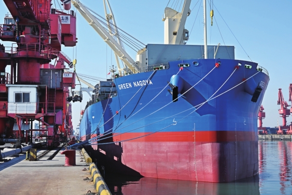 12月16日,山东青岛港“东南非直达快航”正式开通。该航线自青岛始发,点对点直航东南非,实行周班运营。据介绍,该快航直达航行时间缩短到20天左右,为扩大中非贸易提供又一条安全快捷的海上通道。图为当日,“GREEN NAGOYA”轮在青岛港大港码头进行装船作业。新华社 发