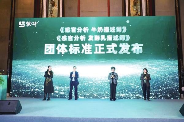 此次会议上,由蒙牛牵头起草,联合中国标准化研究院及多家企业共同研制的两项团体标准正式发布——《T/CAB 0376—2024感官分析 牛奶描述词》和《T/CAB 0377—2024感官分析 发酵乳描述词》。中国食品科学技术学会常务副理事长邵薇,中国乳制品工业协会书记、执行理事长刘美菊、中国标准化研究院农业食品标准化研究所国家市场监督管理总局重点实验室(食品感官分析)主任赵镭和蒙牛集团常温事业部产品研发中心总经理李洪亮出席了发布仪式。这是我国乳品行业首次建立科学、系统的感官评价语言框架,填补了该领域的行业空白,标志着乳品行业在感官标准化评价领域迈上新台阶。