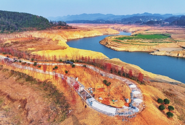 12月19日,花垣县紫霞湖,工人在进行巡护步道建设施工。由中铁城建集团承建的花垣县十八洞紫霞湖美乡村振兴(一期)项目,通过湿地恢复、建设巡护步道、种植水生陆生植物等,不断推进花垣古苗河国家湿地公园湿地的保护与修复。目前项目总体已完成70%,预计12月31日前完成绿化种植及园建工程。