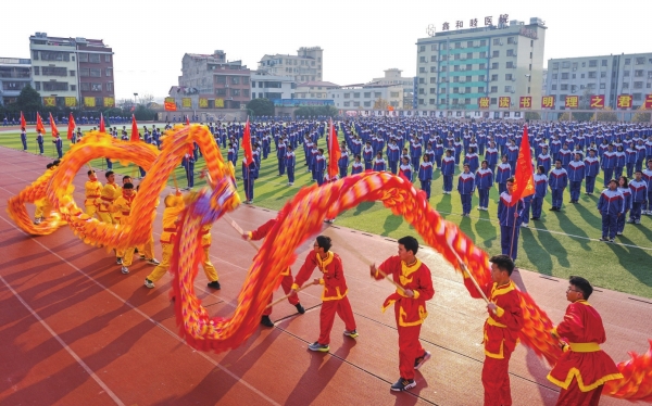 12月20日,娄底市曾国藩高级中学,学生在大课间进行舞龙表演。近年来,该校将阳光体育大课间与传统文化、国防教育相结合,开展军体拳、舞龙舞狮、跑操等体育运动,让学生在体育锻炼中享受乐趣、增强体质、锤炼意志。