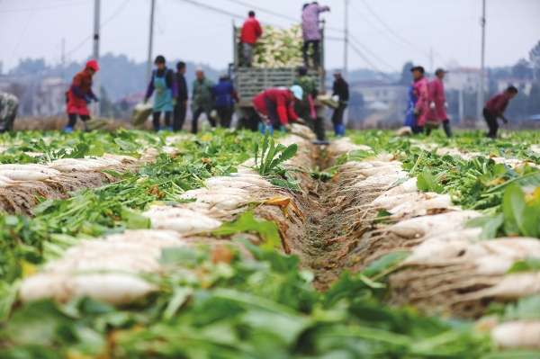 12月21日,村民在采收萝卜。冬至时节,衡阳县关市镇鑫粤农业生态蔬菜种植基地的白萝卜进入采收季,村民加紧采收、清洗和外运,供应市场。