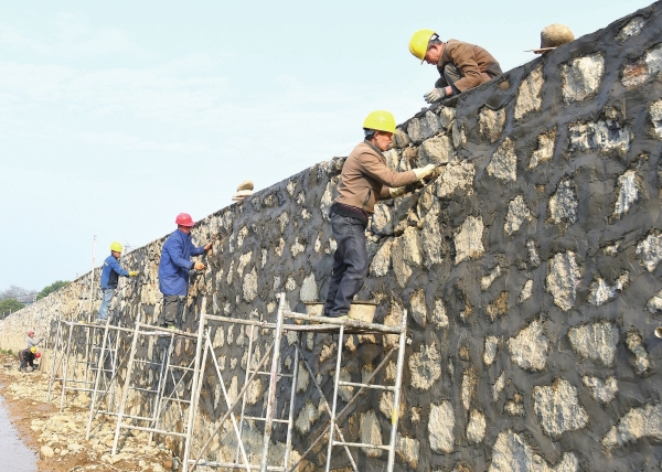 12月22日,江永县潇浦镇潇水河,工人在砌筑河堤。近期,该县利用冬修水利黄金期,做好县域河道水塘清淤工作,提升河道防洪能力。
