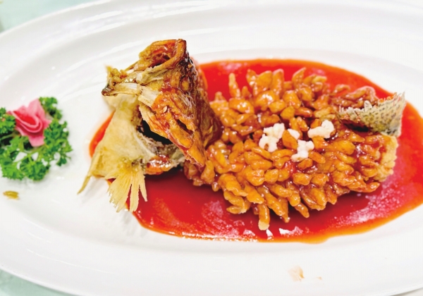 尺把长的鳜鱼在盘中昂头翘尾,鱼身去骨,改上花刀,油炸后端上桌,再浇上酸甜的番茄汁,鱼身吱吱作响,像极了松鼠的叫声,外酥里嫩,酸甜美味。