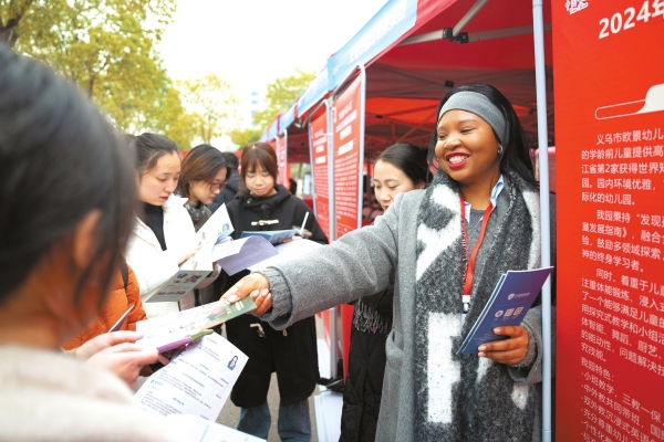 12月23日,长沙师范学院,来自义乌的幼儿园工作人员现场发放招聘资料。当天,由民盟湖南省委会主办,长沙师范学院、长沙市人力资源和社会保障局、义乌市人力资源和社会保障局承办的“暖冬送岗,职引未来”助力大学生就业暨星沙片区高校2025届毕业生冬季双选会举行。此次招聘单位有253个,涉及教育、产品制造、自媒体等多个行业,提供岗位超1200个。