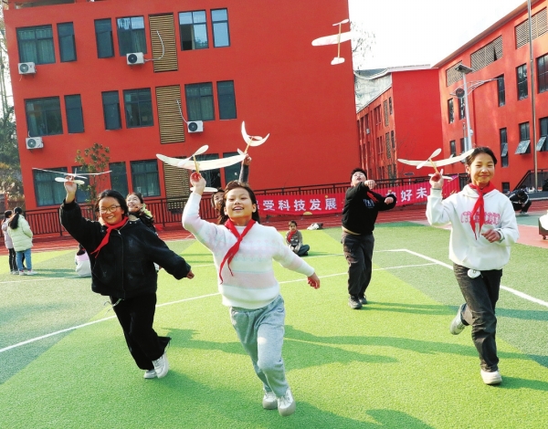 12月23日,保靖县毛沟镇芙蓉小学,学生在放飞自制的飞机模型。